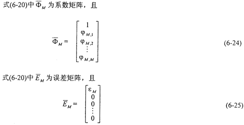 相關(guān)矩陣(6-22)式表示為Toeplity矩陣和Hankel矩陣相乘,使求解AR(M)模型參數(shù)