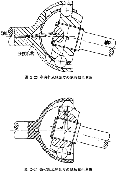 球籠式萬(wàn)向聯(lián)軸器是目前性能最優(yōu)良,應(yīng)用最廣泛的一種等角速萬(wàn)向聯(lián)軸器,根據(jù)結(jié)構(gòu)形式的不同可分為兩大類(lèi),即導(dǎo)向桿式球籠萬(wàn)向聯(lián)軸器和偏心距式球籠萬(wàn)向聯(lián)軸器,分別如圖2-23和圖2-24所示。
