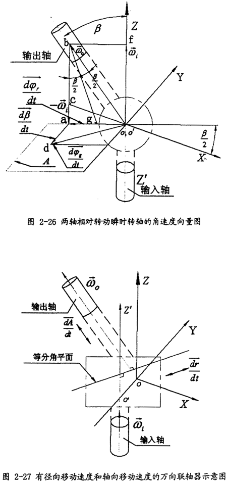 所以軸線(xiàn)相交的等角速萬(wàn)向聯(lián)軸器輸出軸相對(duì)于輸入軸的相對(duì)轉(zhuǎn)動(dòng)瞬時(shí)轉(zhuǎn)軸始終位于兩軸的等分角平面內(nèi)?紤]到萬(wàn)向聯(lián)軸器的一般情形:輸入軸與輸出軸軸線(xiàn)并不位于同一平面內(nèi),存在與輸入軸線(xiàn)和輸出軸線(xiàn)垂直的徑向位移,且有徑向移動(dòng)速度和軸向移動(dòng)速度