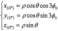 ≈0,cosθ≈1(實際上p<<L,近似處理是合理的),則可得到三小桿的球面中心P在固定坐標系O′X′Y′Z′中的運動軌跡: