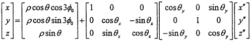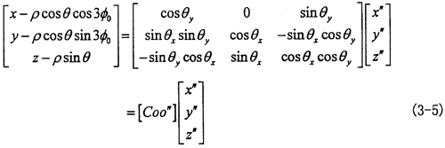 由于動坐標系O″X″Y″Z″的O″Y″軸取得始終垂直于固定坐標系OX軸,可認為先把OXYZ坐標系繞OX軸轉(zhuǎn)過夾角θx,使OY軸與O″Y″軸平行,再繞新的OY軸轉(zhuǎn)過θy,使OX軸與O″X″軸平行,OZ軸也同時平行于O″Z″軸(變換空間位置如圖3-6所示)。則固定坐標OXYZ與動坐標系間的變換關(guān)系如下: