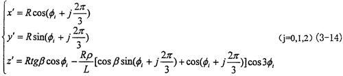 在定坐標系O′X′Y′Z′中輸入軸的三滑道軸線m1、m2、m3方程為: