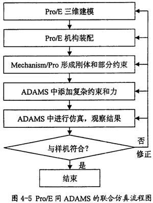 在仿真中如果發(fā)現(xiàn)結(jié)果不對,則我們需要對前面的模型進(jìn)行修正,然后再做仿真分析,直到結(jié)果正確。總而言之利用Pro/E和ADAMS進(jìn)行聯(lián)合仿真,其基本的步驟如圖4-5所示。