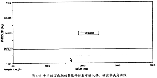 選取合適的步長,在缺省模式下(由前面的自上度為0,可知此時的仿真是運動仿真)對模型做仿真分析,并在結(jié)果中輸出兩軸夾角的測量值曲線圖(如圖4-6所示)以及輸入、輸出軸角速度測量的曲線圖(如圖4-7所示)。