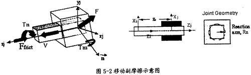 移動副產(chǎn)生摩擦的示意圖如圖5-2所示。在這種運(yùn)動副中只會產(chǎn)生逆向于移動方向v(如圖5-2中藍(lán)色箭頭所示)的摩擦力Ffrict(如圖5-2中紅色箭頭所示),它的產(chǎn)生主要由三種因素,即構(gòu)件間相互作用的徑向力F、構(gòu)件間相互作用的扭矩Tn、構(gòu)件間相互作用的彎矩Tm(這三種力如圖5-2中綠色箭頭所示)。在施加由這些作用力產(chǎn)生的摩擦力時(shí),要考慮徑向力F的大小、等效作用臂長Rn(如圖5-2中右邊圖所示運(yùn)動副間的重疊量和重疊量的變化情況、扭矩Tn的大小和它的等效反作用臂長Rn、彎矩Tm的大小和彎矩的反作用臂長XS(如圖5-2中間圖所示)。另外還得考慮靜摩擦系數(shù)、動摩擦系數(shù)及預(yù)載荷的作用。