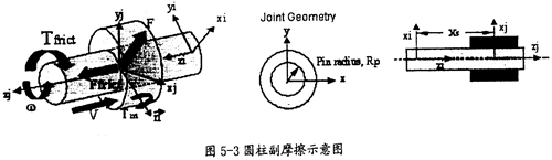 圓柱副產(chǎn)生摩擦的示意圖5-3所示。在這種動動副中會產(chǎn)生逆向于移動方向V(如圖5-3中藍(lán)色箭頭所示)的摩擦力Ffrict(如圖5-3中紅色箭頭所示)及逆向于旋轉(zhuǎn)方向ω(如圖5-3中藍(lán)色箭頭所示)的摩擦扭矩Tfnct(如圖5-3中紅色箭頭所示),它的產(chǎn)生主要由兩種因素,即構(gòu)件間相互作用的徑向力F、構(gòu)件間相互作用的彎矩Tm(這兩種力如圖5-3中綠色箭頭所示)。在施加這些作用力產(chǎn)生的摩擦力時(shí),要考慮徑向力F的大小、圓柱半徑RP(如圖5-3中間圖所示)、運(yùn)動副間的重疊量和重疊量的變化情況、彎矩Tm的大小和彎矩的反作用臂長Xs(如圖5-2中右圖所示),另外還得考慮靜摩擦系數(shù)、動摩擦系數(shù)及預(yù)載荷的作用。