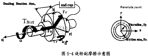 旋轉(zhuǎn)副產(chǎn)生摩擦的示意圖如圖5-4所示。在這種運(yùn)動副中只會產(chǎn)生逆向于旋轉(zhuǎn)方向ω(如圖5-4中藍(lán)色箭頭所示)的摩擦扭矩Tfrict(如圖5-4中紅色箭頭所示),它的產(chǎn)生主要由三種因素,即構(gòu)件間相互作用的徑向力Fr、構(gòu)件間相互作用的軸向力Fa、構(gòu)件間相互作用的彎矩Tr(這三種力如圖5-4中綠色箭頭所示)。在施加由這些作用力產(chǎn)生的摩擦力時(shí),要考慮徑向力Fr的大小、圓柱半徑RP(如圖5-4右圖所示)、軸向力Fα的大小、摩擦半徑Rn的大。ㄈ鐖D5-4右圖所示)、彎矩Tm的大小和彎矩的反作用臂長(即旋轉(zhuǎn)副的長度,如圖5-4中左圖所示),另外還得考慮靜摩擦系、動摩擦系數(shù)及預(yù)載荷的作用。
