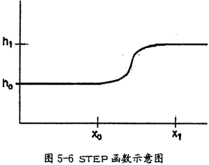 在ADAMS中,STEP函數(shù)近似一個(gè)標(biāo)準(zhǔn)的數(shù)學(xué)STEP函數(shù)(沒有不連續(xù)性),并逐步逼近數(shù)值,例如:驅(qū)動或者力,向上或者向下或者打開和關(guān)閉。它的函數(shù)圖形如圖5-6所示。格式同各參數(shù)說明如下: