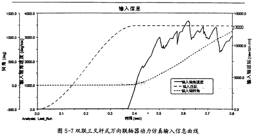 由圖5-7可以看出,雙聯(lián)三叉桿萬(wàn)向聯(lián)軸器在動(dòng)力仿真的過(guò)程中,輸入力矩逐步以STEP函數(shù)的趨勢(shì)增大,當(dāng)其克服靜摩擦力后,開(kāi)始轉(zhuǎn)動(dòng),在角速度達(dá)到一定的值后,出現(xiàn)波動(dòng)的現(xiàn)象(紅色線條所示),并非如平常想象的近似等速轉(zhuǎn)動(dòng)。