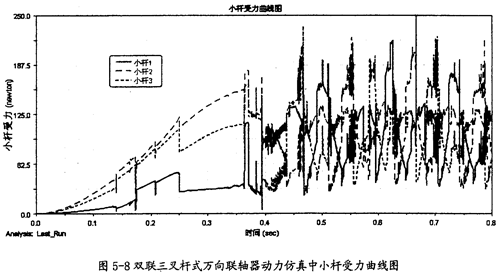 由圖5-8可以看出,雙聯(lián)三叉桿式萬(wàn)向聯(lián)軸器在動(dòng)力仿真的過(guò)程中,一端的三個(gè)小桿在移動(dòng)副中受到的力逐步增加,當(dāng)系統(tǒng)開(kāi)始轉(zhuǎn)動(dòng)后,它們受到的力呈現(xiàn)有規(guī)律的波動(dòng),但互相之間有一個(gè)相位差。正是由于它們的受力變動(dòng)復(fù)雜,故它們?cè)诨瑮U套軸上的三個(gè)反力的向量和就可能不為0,這樣的結(jié)果是,它們除了在滑桿套軸(輸入軸)上形成負(fù)載扭矩外,還會(huì)產(chǎn)生附加彎矩的作用。