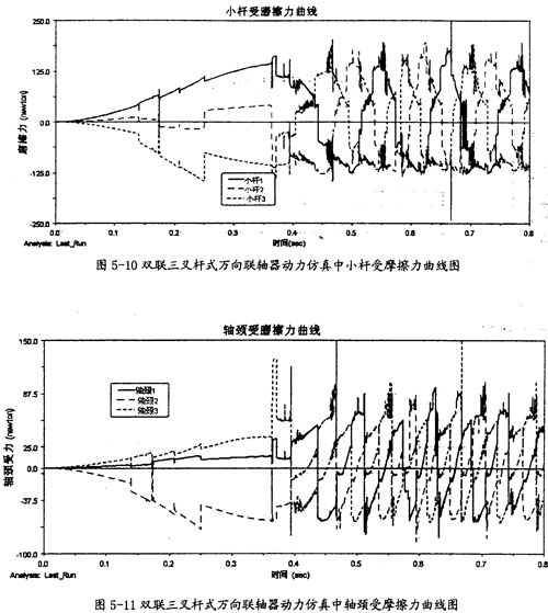 由圖5-12可以看出,雙聯(lián)三叉桿式萬(wàn)向聯(lián)軸器在動(dòng)力仿真的過(guò)程中,其一端的三個(gè)小桿所受的摩擦力的合力變動(dòng)較有規(guī)律,其值在開(kāi)始一段平滑,其后幾乎以0為中心波動(dòng)。由于這三個(gè)摩擦力的方向均平行于輸入軸或輸出軸軸線,故此合力會(huì)在輸入軸和軸出軸上產(chǎn)生軸向的力,在輸入軸和輸出軸上產(chǎn)生摩擦扭矩。如取其水平較高值60牛來(lái)計(jì)算,它產(chǎn)生的摩擦扭矩為270N·mm(60×0.3×15=270,其中0.3為動(dòng)摩擦系數(shù),15為摩擦半徑),此值相對(duì)圖5-13中的值而言相當(dāng)小。