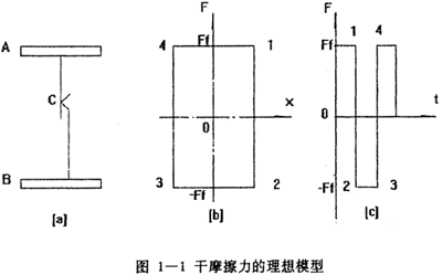 雙線(xiàn)性模型是非線(xiàn)性遲滯系統(tǒng)模型中最簡(jiǎn)單的一種,而且也是最為久遠(yuǎn)的模型,對(duì)于它的初始機(jī)理研究最早可追溯到三十年代的Deo Hartog,他在研究干摩擦?xí)r提出了干磨擦的理想模型,他認(rèn)為在一個(gè)具有干摩擦面的單自由度系統(tǒng)中,干摩擦力隨相對(duì)滑移位移的關(guān)系可用一矩形來(lái)表示,如圖1-1所示。當(dāng)該系統(tǒng)受到外力激勵(lì)發(fā)生運(yùn)動(dòng)時(shí),干摩擦力總是與運(yùn)動(dòng)速度反向而且阻礙運(yùn)動(dòng),進(jìn)而耗損系統(tǒng)的能量,從時(shí)域的角度看,干摩擦力的波形為矩形波,Den Hartog還按能量耗散相等原理,把理想干摩擦等效成粘性阻尼。實(shí)際上干摩擦交界面,在外力小于摩擦力時(shí),兩邊就有變形,隨著外力的增加,此變形隨之增大,這是因?yàn)榻唤缑鎯蛇叺奈镔|(zhì)有一定的彈性。即使兩邊有較大的滑移時(shí),交界面上的干摩擦力仍然不是常數(shù),而是隨振幅的增大而緩慢上升的。Earlestes等人對(duì)此作了描述,認(rèn)為一旦交界面有了滑移,干摩擦的線(xiàn)性力不是常數(shù)(4Ffπ),而是與相對(duì)位移X有關(guān),從Ff變到4Ff/π,表達(dá)式為