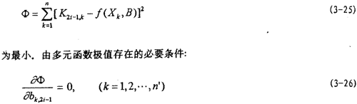 得一組線性方程組,在n>k的情況下,聯(lián)立求解這一線性方程組即可求得唯一的一組B值。根據(jù)此法求得(3-13)式中參數(shù)值并代回可得: