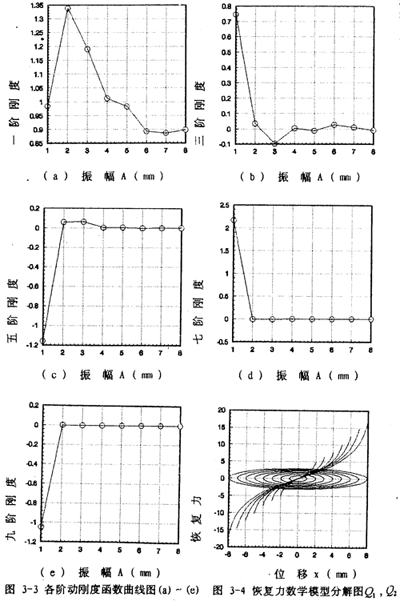 將(3-27)式中剛度函數(shù)作成曲線如圖3-3(a)-(e)所示,由一階動剛度函數(shù)圖3-3(a)可知,振幅在lmm~2mm范圍內(nèi)時,動剛度隨振幅增大而增大,呈硬特性;當振幅在2mm~7mm范圍內(nèi)時,動剛度隨振幅增大而減小,呈軟特性;當振幅在7mm~8mm范圍時,動剛度隨振幅增大略有回升。由此圖可知,在聯(lián)軸器初始小振幅和極限振幅附近范圍內(nèi),動剛度呈硬特性,而在中間振幅范圍內(nèi)呈軟特性。K5(A)和K9(A)也具有類似的特性。而K3(A)和K7(A)在小振幅時呈軟特性,這樣的動剛度特性滿足船舶緩沖減振降噪的要求,即在一般低能量風浪流作用下,該聯(lián)軸器鋼絲繩元件的變形小,動剛度大,呈硬特性,這能保證船舶推進軸系的基頻高于風浪流的顯著能量頻率;在大能量風浪流和沖擊作用下時,聯(lián)軸器由于載荷增大而變形增大,這種情況下動剛度軟化,使船舶推進軸系頻率變小,向遠離大能量風浪流和沖擊顯著能量頻率一側偏移,在遲滯阻尼下耗散能量,使軸系沖擊振動響應降低。由(3-27)式和(3-12)式可作出相應的彈性恢復力單值曲線如圖3-4所示。將圖3-4中代表彈性恢復力的單值曲線與圖3-2中的單值曲線比較可知,(3-12)式能較好地描述聯(lián)軸器彈性恢復力隨振幅變化的規(guī)律。