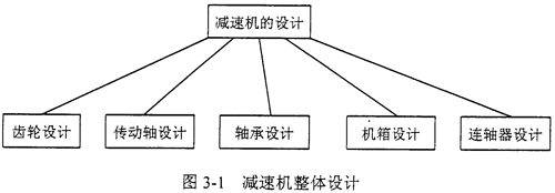減速機(jī),作為一個完整的傳動系統(tǒng),其設(shè)計包括:齒輪設(shè)計,傳動軸設(shè)計,軸承設(shè)計,機(jī)箱設(shè)計以及連軸器設(shè)計,如圖3-1所示。