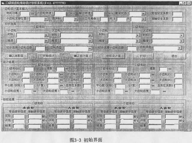 在這三類參數(shù)中,用戶參數(shù)是要由用戶給定,齒輪特性參數(shù)是要得到的結(jié)果,齒輪設(shè)計參數(shù)是一種中間描述參數(shù),它需要通過一系列的復(fù)雜的計算求解,而齒輪設(shè)計的科學(xué)性也就是通過對齒輪設(shè)計參數(shù)的精確確定而實(shí)現(xiàn)的,具體計算機(jī)實(shí)現(xiàn)公式見3.6-3.8;齒輪的接觸強(qiáng)度與彎曲強(qiáng)度校核分別見3.3和3.4。系統(tǒng)的參數(shù)初始輸入界面見圖3-3。