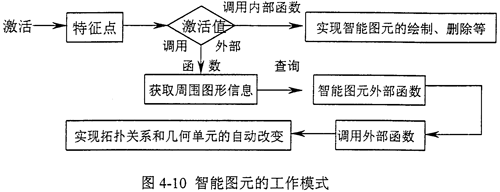 通過(guò)對(duì)特征點(diǎn)的激活,首先判斷激活值,是調(diào)用外部函數(shù)還是調(diào)用內(nèi)部函數(shù),如果是調(diào)用內(nèi)部函數(shù),則根據(jù)激活值,調(diào)用某個(gè)內(nèi)部函數(shù),實(shí)現(xiàn)智能圖元自身的操作,如刪除、放大、旋轉(zhuǎn)等等;如果是調(diào)用外部函數(shù),則再獲取周圍圖元信息,并以此查詢外部函數(shù)庫(kù),得到某個(gè)外部函數(shù),則調(diào)用此外部函數(shù),實(shí)現(xiàn)智能圖元的拓?fù)潢P(guān)系和幾何單元信息的改變。(如圖4-11所示)