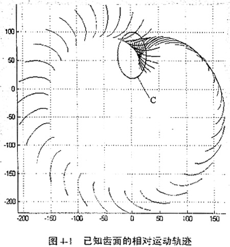 在已知齒輪齒面一個周期的相對運動所留下的運動軌跡中,我們可以看出,在區(qū)域C中出現(xiàn)了一個清晰的包絡面,它就是所求的未知齒面,即兩齒面在C區(qū)嚙合,稱C區(qū)為嚙合區(qū),而在C區(qū)之外,也會出現(xiàn)包絡,但那只是幾何意義上的共軛點,不產(chǎn)生真正意義上的嚙合傳動;已知齒面在嚙合區(qū)域與非嚙合區(qū)域有較清晰的界限;在嚙合區(qū)域,已知曲面與所求齒面的共軛關系是簡單的,無論是否會出現(xiàn)二次接觸,這一區(qū)域的共軛曲面都可以用數(shù)字化共軛曲面求解方法求出。
