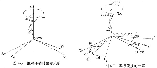 因圖4-6所示的兩坐標系的關系相對較復雜,為便于進行空間坐標變換的計算,可將變換S1→S2分解為S1→S3→S4→S2。如果規(guī)定從旋轉(zhuǎn)軸的正向看下去逆時針旋轉(zhuǎn)方向為正,順時針方向為負,則S1→S3表示S1繞z1軸旋轉(zhuǎn)-ω1t角度,S3→S4表示S3繞y3軸旋轉(zhuǎn)-θ角度,S4→S2表示S4繞z4軸旋轉(zhuǎn)ω2t角度。坐標系的分解變換如圖4-7所示。