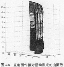 以上述計算出的擺動包絡面為已知齒面,按照兩齒輪的運動關系,用前述介紹的方法,求出擺動包絡面的嚙合面,這個嚙合面既滿足已知直齒面在一定角度范圍內(nèi)擺動,又滿足兩齒面嚙合傳動,它是一個鼓形齒面。在兩齒面?zhèn)鲃雍鸵阎饼X輪擺動的任何一個位置,鼓形齒面和已知直齒面都共軛接觸。