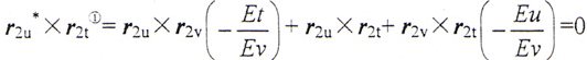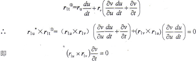 為了使上述向量方程變?yōu)闃肆糠匠,使等式兩端點積以r2u×r2v(≠0),并按拉格朗日恒等式展開,整理后得