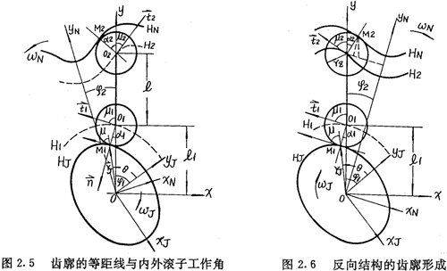 本章根據(jù)推桿減速器的結(jié)構(gòu)特征,找出了推桿內(nèi)外滾子工作角之間的關(guān)系。這種關(guān)系不僅適用于激波器廓形為偏心圓的單激波推桿減速器結(jié)構(gòu),而且也適用于激波器廓形為非圓弧曲線的多激波推桿減速器。利用內(nèi)外滾子工作角之間的關(guān)粵和法向等距線的幾何性質(zhì),首次分析研究了激波器廓形為任意形狀非圓弧曲線的多激波推桿減速器的齒廓形成理論,與傳統(tǒng)的包絡法相比,具有概念清晰,所得公式形式簡單的特點,通過實例計算,證明了激波器為偏心圓的推桿減速器,其內(nèi)齒圈齒廓曲線不是擺線這一重要結(jié)論。