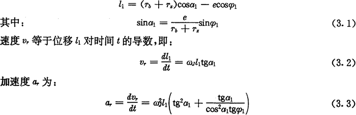 推桿在工作行程開始時(shí),l1值為最小,這時(shí)lmin=Tb+Tz-e,α1=0,φ1=0,vr=0,