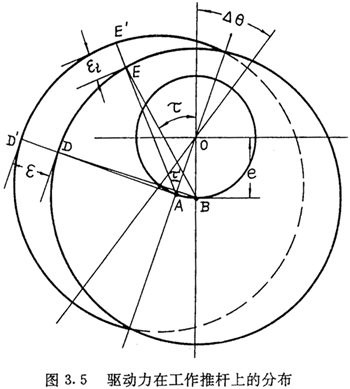 設(shè)傳動(dòng)構(gòu)件之間無間隙,并設(shè)激波器是完全剛性的。在驅(qū)動(dòng)力矩作用下,各工作推桿的內(nèi)滾子在與激波器接觸處產(chǎn)生法向彈性變形,使激波器轉(zhuǎn)過一個(gè)微小的角度△θ,如圖3.5所示,則可確定彈性變形量εi的分布規(guī)律。