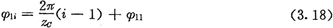 由于相鄰兩推桿所夾的中心角為2π/ZC,在某一時(shí)刻,只要其中一個(gè)工作推桿所對(duì)應(yīng)的激波器位置角(激波器相對(duì)該推桿從初始工作位置轉(zhuǎn)過的角度φ1)確定后,其它各工作推桿所對(duì)應(yīng)的激波器位置角也隨之確定下來。設(shè)各工作推桿所對(duì)應(yīng)的最小激波器位置角為φ11,如圖3.6所示,則從對(duì)應(yīng)激波器位置角為φ11的這個(gè)工作推桿開始,順序第i個(gè)工作椎桿所應(yīng)的激波器位置角φ1i為: