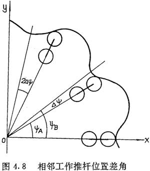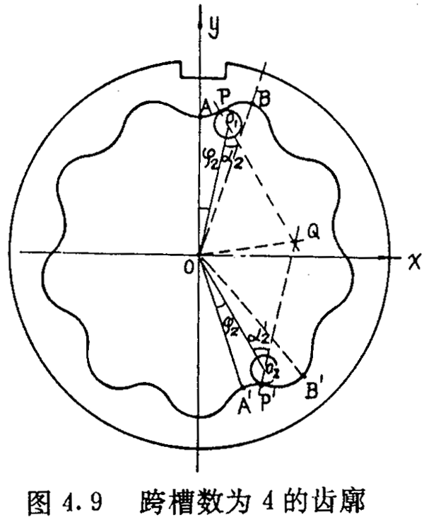 如圖4.9 所示,AB是其中一個齒槽的一側齒廓,A′B′是跨槽數(shù)為K(圖中k=4)的一個齒梢的另一側齒廓,它們是兩個性質(zhì)不同的齒廓。若把AB看成是工作齒廓,則A′B′是非工作齒廓。選擇圖4.9所示的坐標系,讓坐標原點O與內(nèi)齒圈幾何中心重合,y軸與OA重合。設P(x,y)為AB齒廓上的一點,在P點與內(nèi)齒圈齒廓相接觸的外滾子的位置角為φ2,在A′B′上取P點的對應點P′,使∠A′OO2=φ2,P′點與P點是關于∠AOA′的平分線完全對稱的,即0P′=OP,a2=a2′,OO1=OO2,圖4.9中PO1與P′O2相交在Q點,它們并不共線,因此P′點與P點不具有共同的法線。假設隨著P點位置的改變(當然P′點也隨著P的改變而改變),使PO1與P′O2在同一條直線上,此時P′與P就有共同的法線,此時: