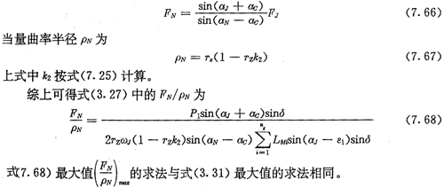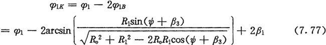 上式隱含地表達(dá)了αc與轉(zhuǎn)角φ1的關(guān)系,因而可從方程式(7.51)中解出αc來,αc的取值范圍是0~π。若解出的αc大于π/2時,表明圖7.7中Fc的方向?yàn)镻點(diǎn)右上方指向P點(diǎn)。