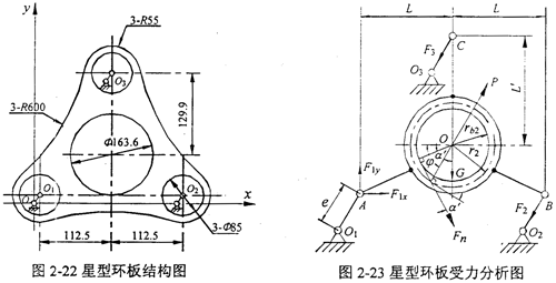 再次分析星型少齒差減速機(jī)的情況,圖2-22所示為星型減速機(jī)一塊環(huán)板的結(jié)構(gòu)圖,它的受力情況和坐標(biāo)系選取如圖2-23所示。