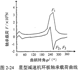 L=112.5mm,L′=129.9mm,Z1=42,Z2=44,m=3.5mm,α=20°,α′=37.356°,n=1440r/min,T=300N·m,b=20mm。則輸入軸、兩個(gè)支承軸的偏心軸頸上的環(huán)板軸承載荷F1、F2、F3隨輸入曲柄轉(zhuǎn)角φ變化的曲線如圖2-24所示。