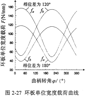 L1=145mm,L2=145mm,Z2=42,Z1=44,m=3.5mm,a=20°,a′=37.356°,T=875N·m,n=1440r/min,b1=b2=25mm。則環(huán)板左孔Ai單位寬度上的載荷fa、環(huán)板右孔Bi單位寬度上的載荷fb隨輸入曲柄轉(zhuǎn)角φ變化的曲線如圖2-27所示。