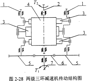 三環(huán)減速機(jī)是為適應(yīng)現(xiàn)代機(jī)械設(shè)備對(duì)傳動(dòng)機(jī)構(gòu)的新要求而開發(fā)的一種以漸開線少齒差行星齒輪傳動(dòng)原理工作的新型傳動(dòng)裝置,本文所研究的三環(huán)減速機(jī)傳動(dòng)結(jié)構(gòu)如圖2-28所示,它由兩根二級(jí)高速偏心輸入軸1,低速輸出軸2,三片內(nèi)齒環(huán)板(兩塊兩側(cè)環(huán)板3和一塊中間環(huán)板3′)和外齒輪4構(gòu)成。三片內(nèi)齒環(huán)板偏心安裝在兩根高速軸上1上,為了克服二級(jí)偏心輸入軸的死點(diǎn)位置和增大傳動(dòng)比,采用兩個(gè)分流定軸齒輪5分別帶動(dòng)兩個(gè)偏心輸入軸,而齒輪5則由一級(jí)輸入軸7上的主動(dòng)齒輪6帶動(dòng)。三個(gè)內(nèi)齒環(huán)板偏心之間的相位差為π,并且考慮慣性力平衡,中間環(huán)板的厚度取為兩側(cè)環(huán)板厚度的2倍,它們都與外齒輪4相嚙合,外齒輪4安裝在輸出軸2上,各軸均平行配置。