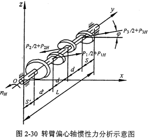 由于中間環(huán)板處轉(zhuǎn)臂偏心軸上放置兩個(gè)圓柱滾子軸承NU209/P6,而兩側(cè)環(huán)板處轉(zhuǎn)臂偏心軸上放置一個(gè)圓柱滾子軸承NU209/P6,假設(shè)一個(gè)圓柱滾子軸承NU209/P6的質(zhì)量為mH,它們的轉(zhuǎn)速nH相同,參考公式(2-4),則轉(zhuǎn)臂偏心軸所受轉(zhuǎn)臂偏心軸承的慣性力為:
