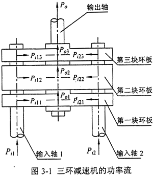 “功率分流”是三環(huán)減速機(jī)的顯著優(yōu)點(diǎn),下面本章從三環(huán)減速機(jī)中的功率流動(dòng)來(lái)分析三環(huán)減速機(jī)的載荷分配。三環(huán)減速機(jī)中的功率流如圖3-l所示,假定內(nèi)齒環(huán)板載荷按嚙合線(xiàn)長(zhǎng)度均勻分布,則在輸出軸上,我們有: