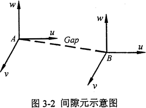 在I-DEAS中,間隙元是為防止兩接觸面產(chǎn)生相互嚙入干涉而定義的,如圖3-2所示,A、B分別為具有初始間隙的分離接觸面上的兩節(jié)點(diǎn),把這兩節(jié)點(diǎn)用間隙元Gap連結(jié)起來(lái)。在I-DEAS中,間隙元主要有三個(gè)屬性,即初始間隙δ0、方位碼u、同軸標(biāo)志Flag,并且,這三個(gè)值是相互關(guān)聯(lián)的。初始間隙并非模型圖中兩節(jié)點(diǎn)之間的距離,而是由用戶(hù)給定的一個(gè)精確值,以避免建模誤差。方位碼指定間隙元的方向,具有從-6到+6之間除O之外的的12個(gè)值,分別代表6個(gè)自由度的正負(fù)方向,即沿x、y、z軸的移動(dòng)和轉(zhuǎn)動(dòng)方向。同軸標(biāo)志取0或1,當(dāng)Flag=0時(shí),方位碼有效,間隙元沿某一指定坐標(biāo)方向;Flag=1時(shí),方位碼無(wú)效,間隙元沿兩節(jié)點(diǎn)連線(xiàn)方向。在圖3-2中,設(shè)指定方位碼為沿u向,F(xiàn)lag=0,則當(dāng)uA-uB≤δ0時(shí),認(rèn)為間隙元沒(méi)有閉合,接觸面間不會(huì)產(chǎn)生應(yīng)力應(yīng)變。而一旦uA-uB>δ0,則認(rèn)為間隙元已閉合,間隙元在指定方向?qū)⒕哂泻艽蟮膭偠龋ㄈ笔r(shí)系統(tǒng)一般取接觸面材料的三階),此時(shí)兩節(jié)點(diǎn)無(wú)法沿指定方向相互嵌入,而只能沿指定方向切向運(yùn)動(dòng)。如指定接觸面摩擦系數(shù),閉合后的間隙元還將具有一定的橫向剛度,即沿切向摩擦阻尼產(chǎn)生的等效剛度。