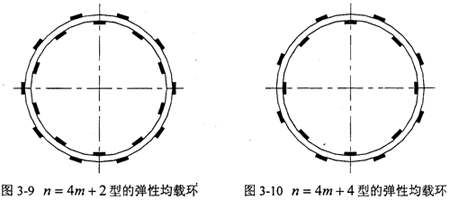 根據(jù)彈性均載環(huán)的外凸臺(tái)數(shù)或內(nèi)凸臺(tái)數(shù)可將這種低剛性彈性支承分為兩類(lèi),一類(lèi)凸臺(tái)數(shù)為n=4m+4,另一類(lèi)凸臺(tái)數(shù)為n=4m+2,m可為任意自然數(shù)。對(duì)于圖3-9,m=2;對(duì)于圖3-10,m=l。
