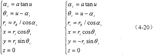 在I-DEAS軟件建模模塊中,已經(jīng)給出一個變量u,它的缺省取值范圍為u∈(0,1),根據(jù)壓力角的實際取值范圍,可以將其設為u=tanαi,則輪齒漸開線的參數(shù)方程可以寫成: