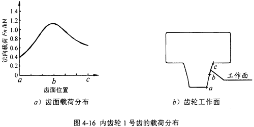 經(jīng)過間隙單元法迭代計算,得到嚙合過程中,由于輪齒的變形而形成了多齒接觸。圖4-14所示為由于輪齒的變形,形成了5個齒的接觸,以及載荷在輪齒之間的分配比例。當有5個齒參與嚙合時,最大主應力為73MPa;假定內(nèi)、外齒輪的1號齒在齒面上b點相互接觸,圖4-15所示為輪齒接觸時,外齒輪上載荷最大的輪齒1號面的齒面載荷分布情況:圖4-16所示為輪齒接觸時,內(nèi)齒輪上載荷最大的輪齒1號面的齒面載荷分布情況。
