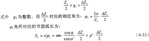 下面來分析它的裝配條件,由于本文提出的新型三環(huán)減速機環(huán)板相互之間的相位差為180°,所以在分析時,可以只分析兩塊環(huán)板的裝配情況。圖4-19所示為裝配條件分析圖,在兩塊環(huán)板的偏心所構成的π角內(nèi),外齒輪1的齒數(shù)為: