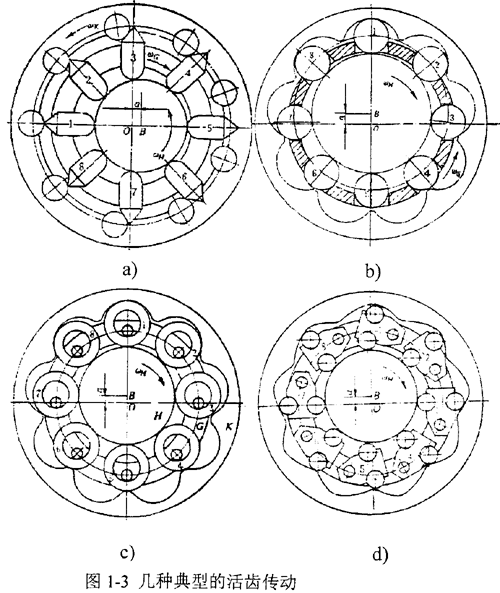 活齒傳動,全稱為“活齒少齒差行星齒輪傳動”,是一種由K-H-V 型少齒差行星齒輪傳動演化而成的一種新型齒輪傳動。它的特點(diǎn)是固定輪上的齒形制成圓弧或其他曲線,行星輪上的各輪齒改用單個的活動構(gòu)件(如滾柱)代替,而這些構(gòu)件分別置于輸出軸上沿周向分布的槽孔中,當(dāng)主動偏心構(gòu)件(波發(fā)生器)驅(qū)動時,它們將在槽孔中活動,故稱為“活齒”。常見的活齒傳動分為推桿活齒傳動(圖1-3a)、滾柱(鋼球)活齒傳動(圖1-3b)、套筒活齒傳動(圖1-3c)、擺動活齒傳動(圖1-3d)等。活齒結(jié)構(gòu)形式最初是由德國人于30 年代提出的,40 年代德國將活齒傳動技術(shù)應(yīng)用于汽車的轉(zhuǎn)向機(jī)構(gòu)中。60 年代前后,美國、前蘇聯(lián)、英國、聯(lián)邦德國等國都先后開展了研究工作。前蘇聯(lián)研究了“柱塞傳動”(活齒傳動的一種型式),提出了它的運(yùn)動分析和力分析的計(jì)算方法。美國學(xué)者提出了推桿活齒減速器傳動裝置,分析了傳動原理,對傳動比和作用力進(jìn)行了計(jì)算,分析了其傳動性能。英國推出了“滑齒減速器”。80年代,前蘇聯(lián)學(xué)者HLHATHIIIeB.P.M推出了另一種活齒傳動形式即“正旋滾珠傳動”,并研究了正旋滾珠活齒傳動的嚙合理論、強(qiáng)度特性、走和性能等。前蘇聯(lián)還將正旋滾珠減速器用于石油鉆探中,成功地解決了渦輪鉆具轉(zhuǎn)速過高的難題。英國也曾對活齒傳動減速器進(jìn)行了系列生產(chǎn),單給傳動的傳動比為20~80,效率為86%~87%,也有雙級和三級傳動,功率N<25馬力。80年代才真正開始的,1986年北京航空學(xué)院陳仕賢教授提出了推桿活齒針齒輪減速機(jī),其結(jié)構(gòu)與樣機(jī)于同看獲日內(nèi)瓦國際發(fā)明博覽會金獎。1987年,周有強(qiáng)教授等人提出了套筒活齒少齒差傳動并申報了國家專利。麻彪對套筒活齒少齒差傳動提出了一種改進(jìn)的結(jié)構(gòu)方案。1988年曲繼方教授提出了軸向活齒傳動的一種結(jié)構(gòu)形式及齒形設(shè)計(jì)方法,同時提出了另一種新型活齒傳動裝置-擺動活齒減速機(jī)并申報國家專利。90年代,江陰東亞減速機(jī)廠的嚴(yán)明工程師提出了一種新結(jié)構(gòu)活齒傳動-移位滾柱減速機(jī),該項(xiàng)技術(shù)獲國家專利并在全國發(fā)明博覽會和北京國際博覽會上均獲得銀獎。此外,我國學(xué)者還獲得了滾道減速機(jī)(CN 86 200768U)、密切圓活齒傳動、變速傳動軸承(CN 85 200923U)等多種專利技術(shù)。