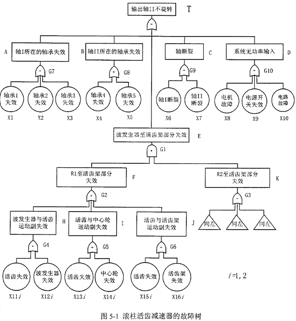 在系統(tǒng)可靠性研究方法中,故障樹(shù)分析(FTA)是一種用于復(fù)雜系統(tǒng)可靠性和安全性分析的有效方法,它可以全面清晰地反映各種故障原因與系統(tǒng)故障的關(guān)系及每一種可能故障的傳遞途徑,為設(shè)計(jì)、管理和維修復(fù)雜系統(tǒng)提供了一種形象的圖解,指導(dǎo)人們?nèi)ゲ檎蚁到y(tǒng)故障,改進(jìn)和強(qiáng)化系統(tǒng)的關(guān)鍵部分。在己知基本事件可靠性數(shù)據(jù)的基礎(chǔ)上,通過(guò)故障樹(shù)分析,人們可以快速地找出系統(tǒng)的薄弱環(huán)節(jié),以進(jìn)一步改進(jìn)設(shè)計(jì)和提高關(guān)鍵件的可靠度,從而提高整個(gè)系統(tǒng)的可靠性。本章在分析滾柱活齒減速器系統(tǒng)結(jié)構(gòu)及其功能關(guān)系的基礎(chǔ)上,建立滾柱活齒減速器的故障樹(shù)模型,確定系統(tǒng)的最小割集,并根據(jù)建立的故障樹(shù)中各事件之間的邏輯關(guān)系以及布爾代數(shù)的運(yùn)算法則,求出滾柱活齒減速器功能破壞即“輸出軸不旋轉(zhuǎn)”這一頂事件的故障概率。