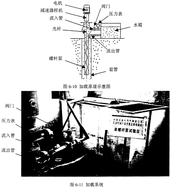 本試驗(yàn)井的加載是通過將并下的水舉升到地面時(shí),人為設(shè)置流水的阻力實(shí)現(xiàn)的。其加載原理見圖6-10所示。其中水箱的水由于重力的作用通過流出管流到地下。螺桿泵工作時(shí),將井下的水舉升到地面并通過流入管送回水箱中,在流入管的管道上設(shè)有閥門和壓力表,通過它們來調(diào)整流入管內(nèi)水的壓力來實(shí)現(xiàn)加載。具體結(jié)構(gòu)照片見圖6-11。