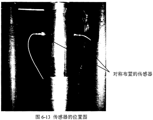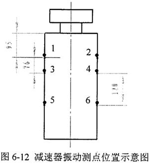 測(cè)點(diǎn)布置方案是關(guān)系到測(cè)量結(jié)果的一件重要工作,應(yīng)選擇信號(hào)傳遞路線最短、最能反應(yīng)減速器振動(dòng)的部位作為測(cè)點(diǎn)。本實(shí)驗(yàn)中測(cè)點(diǎn)對(duì)稱布置在減速器外殼與活齒中點(diǎn)在同一水平線的兩個(gè)點(diǎn)1 、2 上,用以采集第一排活齒引起殼體振動(dòng)的信號(hào)。同樣,測(cè)點(diǎn)3 、4 采集第二排活齒引起殼體振動(dòng)的信號(hào)。測(cè)點(diǎn)5 、6 布置在輸出軸的支承軸承所對(duì)應(yīng)的殼體位置上,用以測(cè)量輸出軸軸承座的徑向振動(dòng)。各測(cè)點(diǎn)的位置示意圖見圖6-12,實(shí)際測(cè)試時(shí)傳感器的位置見圖6-13。