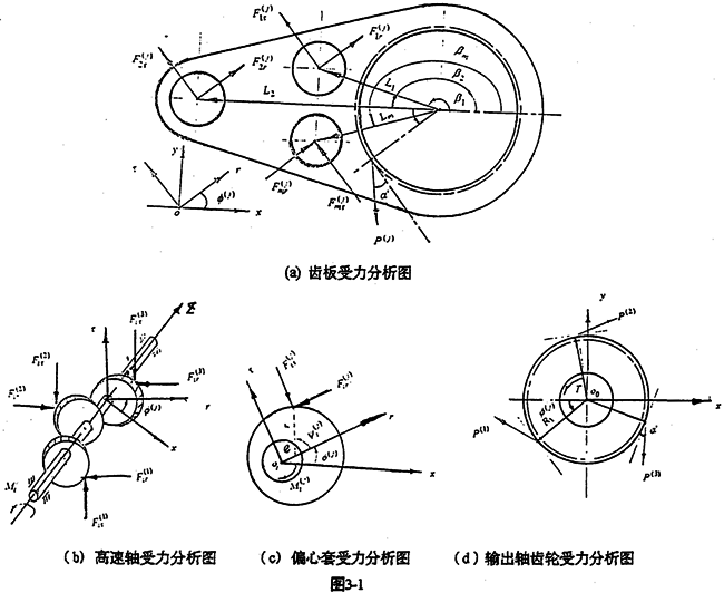 由于多相并列內(nèi)齒行星傳動(dòng)的N片行星齒板結(jié)構(gòu)相同,相鄰兩片之間的相位差為2Ω/N。因此,在一個(gè)周期范圍內(nèi),各片齒板的受力情況完全一樣,故只需分析其中一片齒板即可。齒板及高速軸、輸出軸的受力分析如圖3-1所示。用動(dòng)態(tài)靜力平衡法寫(xiě)出機(jī)構(gòu)的動(dòng)力分析基本方程為