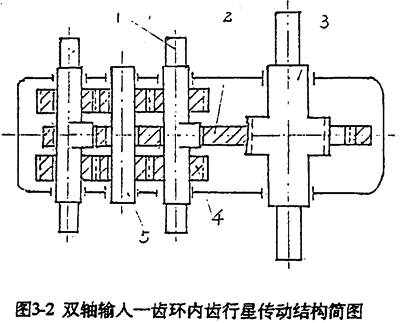一齒環(huán)內(nèi)齒行星傳動按機構克服“死點”的方法,有雙軸式雙軸輸入、雙軸式單軸輸入、以入多軸式等結(jié)構形式。