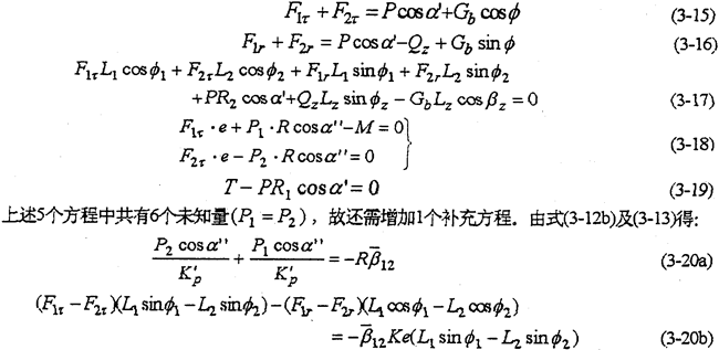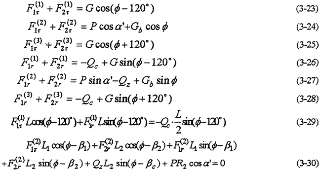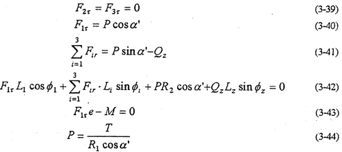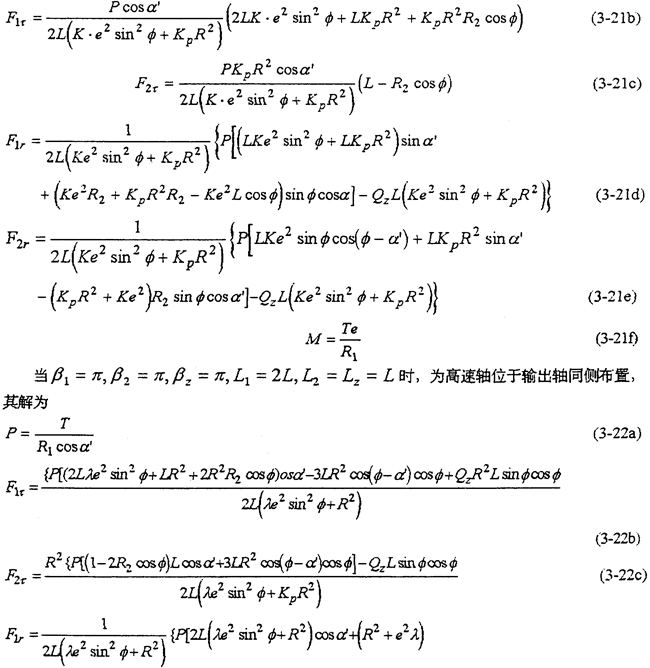 由方程式(3-15)~(3-19)和(3-20)可以完全確定雙軸輸入式的一齒環(huán)內(nèi)齒行星傳動機構的動力參數(shù)。各動力參數(shù)中除嚙合力只與負載大小有關外,其余載荷均與傳動機構的幾何參數(shù)L1,L2,β1,β2,R1,R2,α′,α″等因素有關。故可以通過調(diào)整這些參數(shù),以達到滿足結(jié)構、載荷要求。