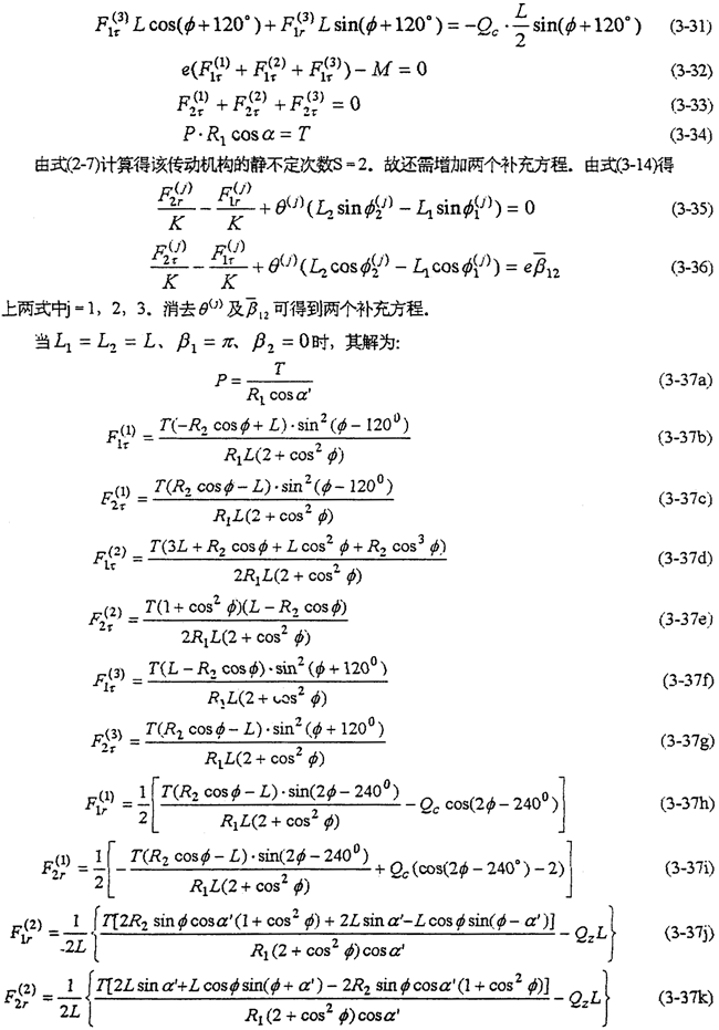 以三相并列雙曲柄機構一齒環(huán)內(nèi)齒行星傳動機構為例(見圖1-3圖3-3),帶行星齒板的雙曲柄機構與另外兩套雙曲柄機構相位差互為120°。疫帶行星齒板轉(zhuǎn)動的相位角為φ,則另兩相雙曲本機構的相位角為φ-120°及φ+120°由動力分析基本方程,取P(1)=P(3)=0,P(j)=P得